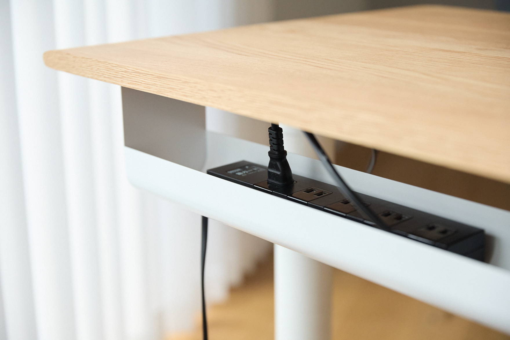 複数の機器を使用される場合、配線トレー内部にコンセントタップを置いておくことで、機器や昇降デスク本体の電源をコンセントタップから取ることができるため、ケーブルをスッキリできます。