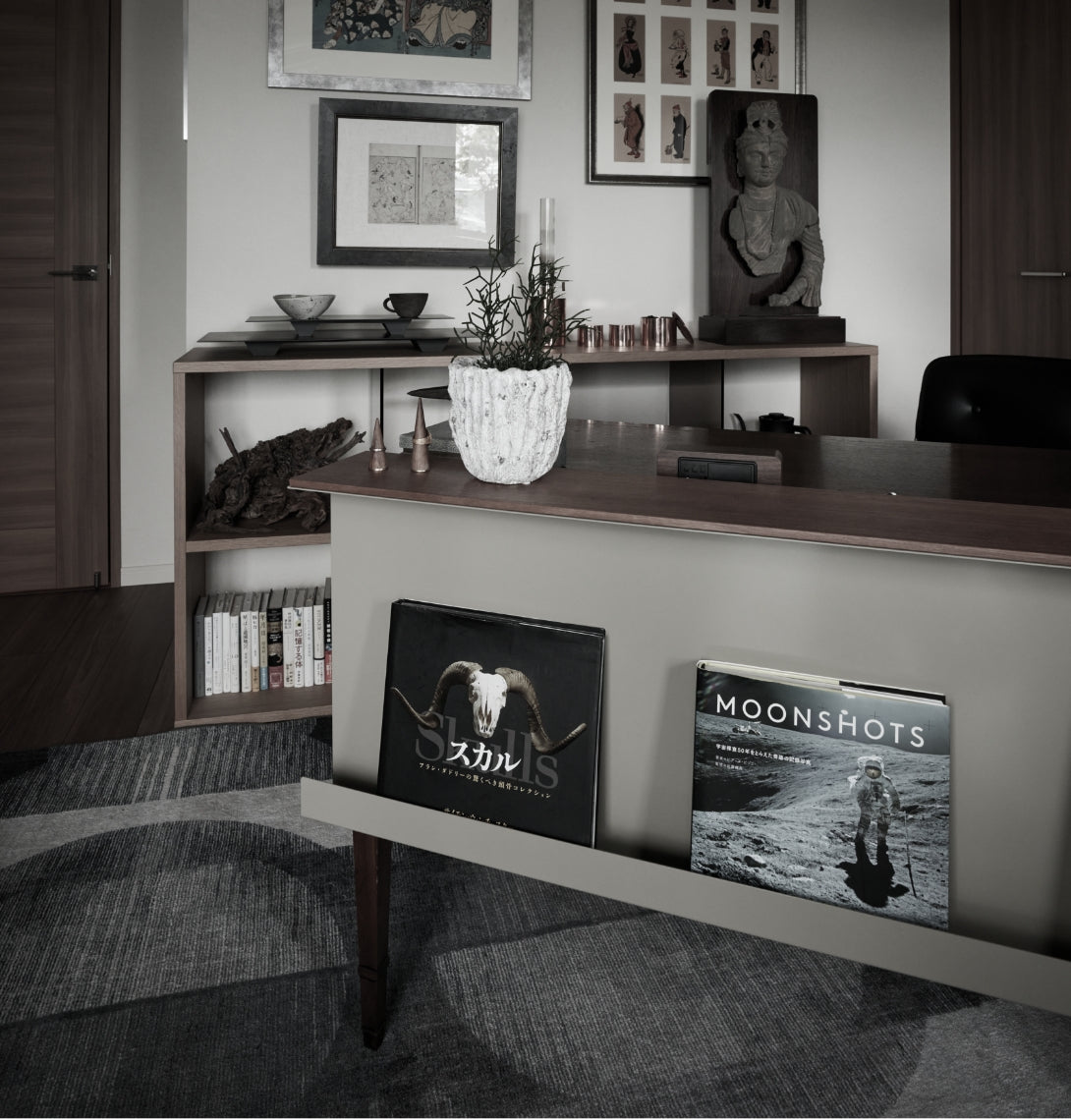 「祖父から受け継いだアンティークデスクを、もっと使いやすいものに」というオーダーから始まったプロジェクトは、佐渡島さんの脳内に迷い込んだかのような豊かなワークスペースそのものを再考し、構成し直すものになりました。