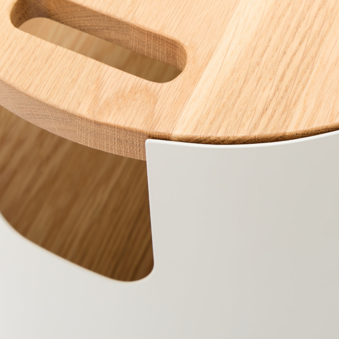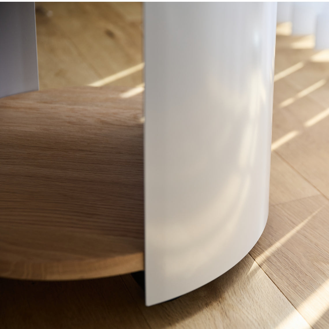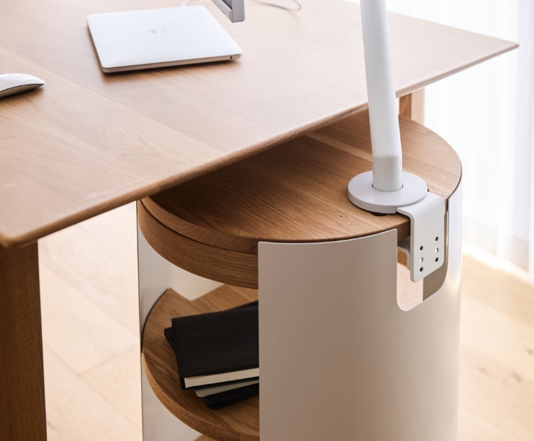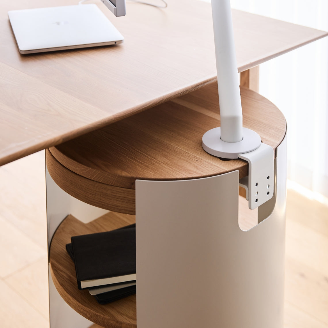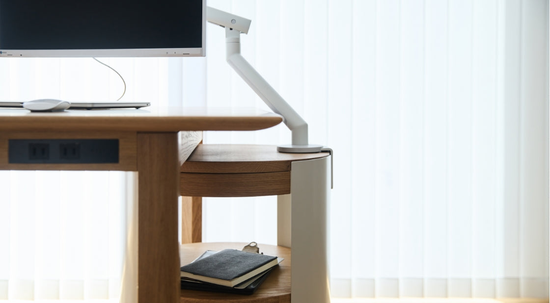 オーク無垢材とグレージュ色のボディの組み合わせによる流麗なフォルムは、モダンインテリアの家具や空間に調和します。