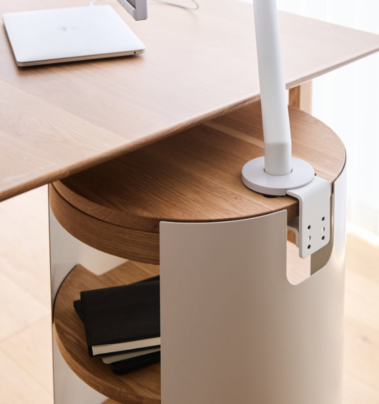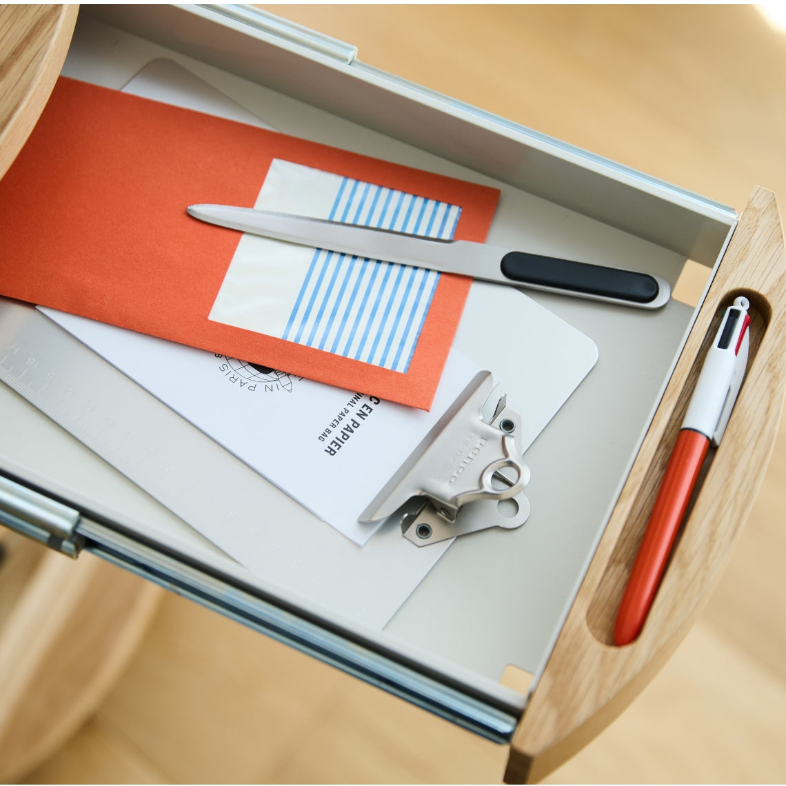 WAAKwagon COLUMNの天板下に取り付けられた浅い引き出しは、そんな紙類をサッとしまえます。前板に小さなペントレイも付いているので、サインが必要なときにも便利です。