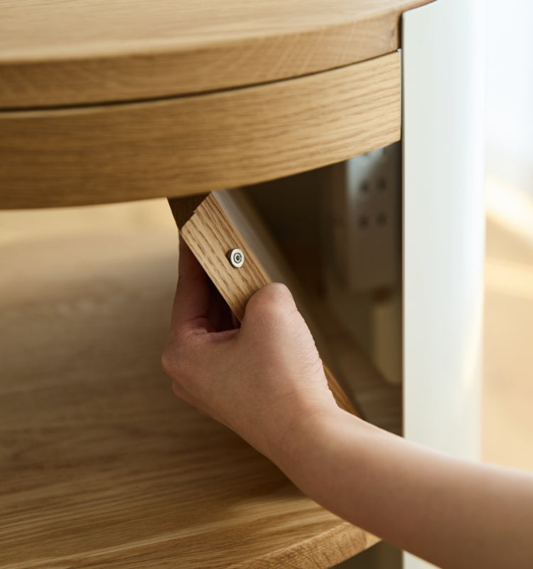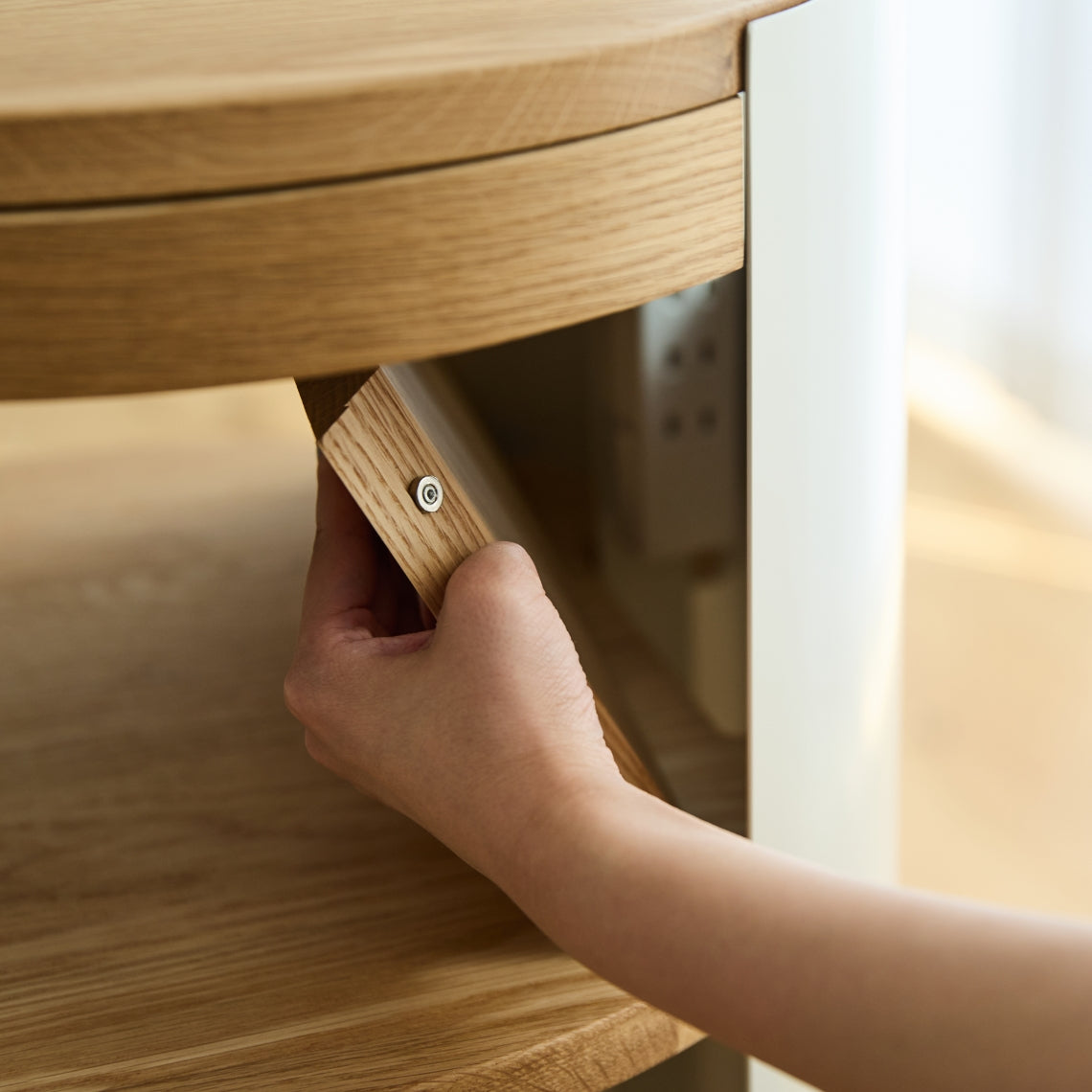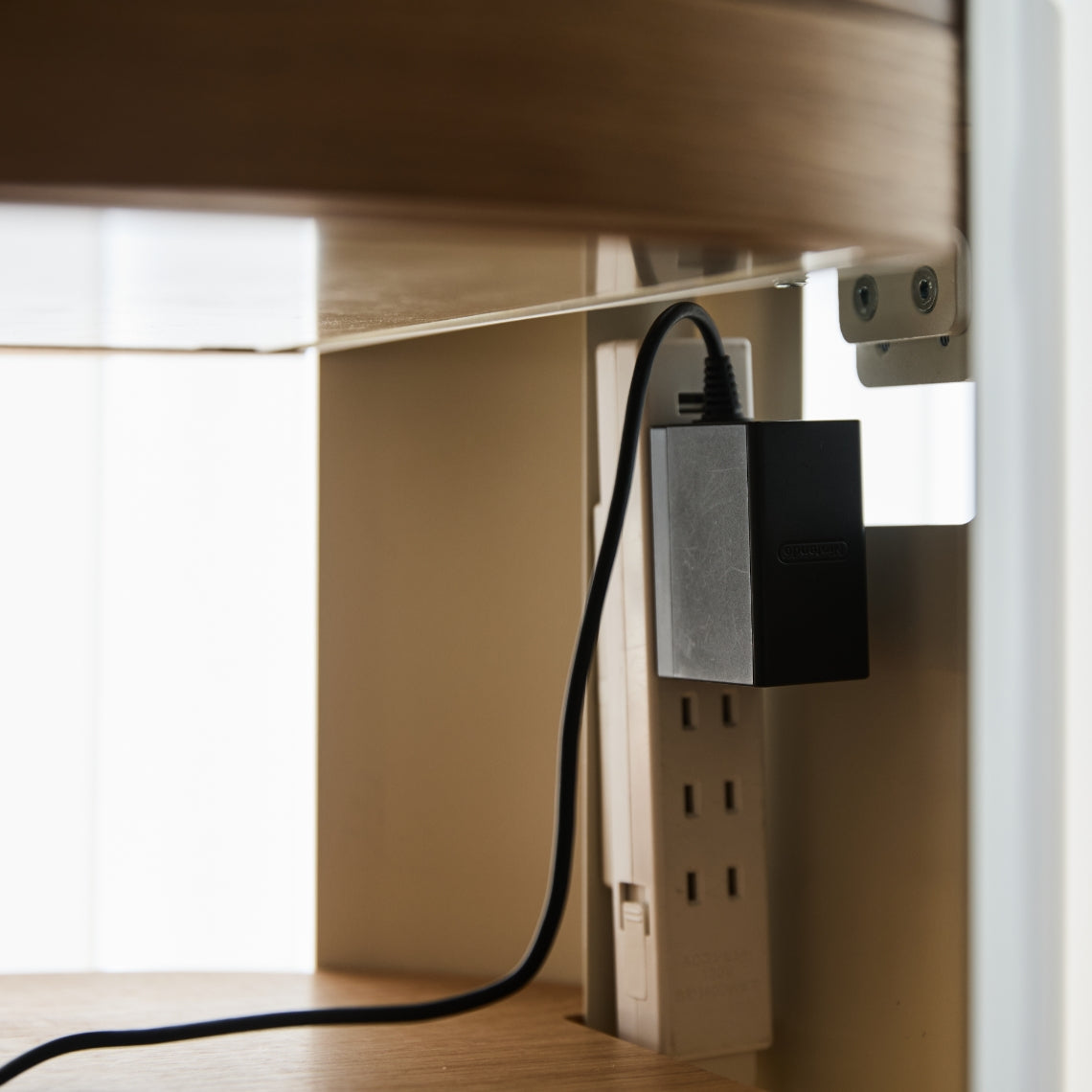 引き出しの端部には配線用の孔が開いているため、収納したまま機器の充電が可能です。
