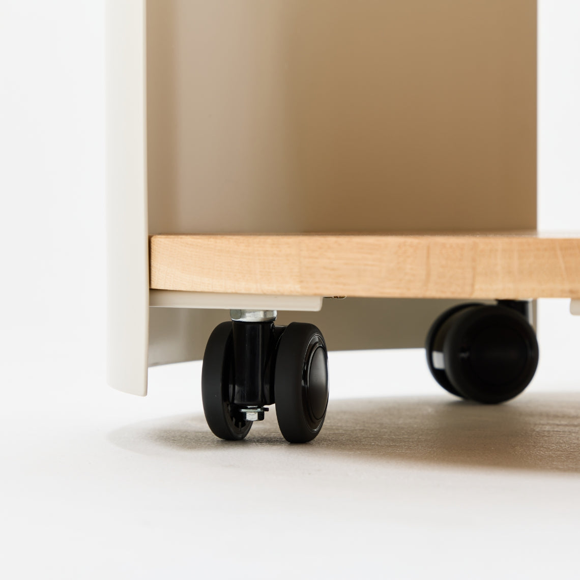 WAAKwagon COLUMNにはいつでもサッと動かせるようキャスターが付いています。住宅での使用を考慮し、床へキズや汚れが付きにくい日本製のポリウレタンキャスターを採用しています。