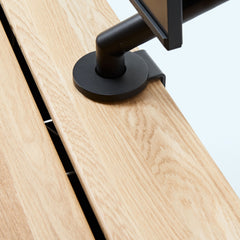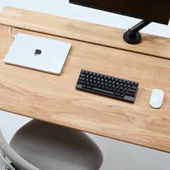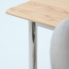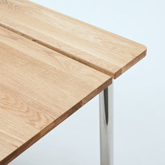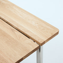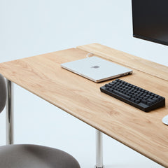 オーク天板の脚には、ステンレススチールを採用。美しさと耐久性を兼ね備えたマテリアルが、ワークスペースに洗練をもたらします。