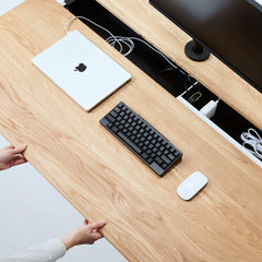 天板後部の固定天板と、手前のスライド天板の間には配線用のスリットを実装。天板を閉じた状態でも必要なケーブルのみ机上に出せるため、充電や外部モニターへ接続するケーブルもすっきりと整えられます。