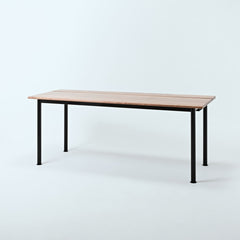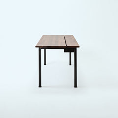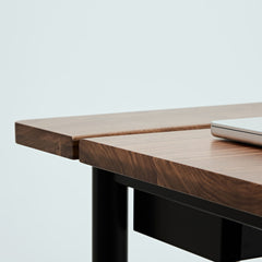 ウォールナット天板の脚には、マットブラックスチールを採用。インダストリアルな質感が、デスクの機能美を際立てます。
